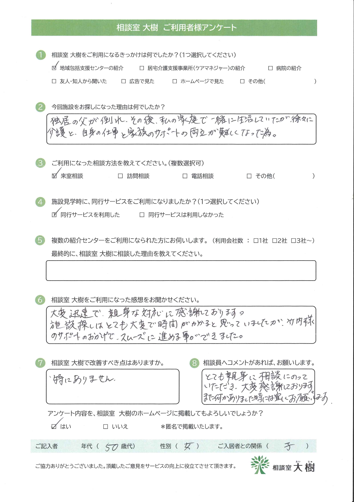ご対象者は、1年ほど前には独居が難しくなり、このところは娘様のマンションに身を寄せられて生活されていました。徐々に認知症が進み、トイレの失敗なども増えてきて、同居での介護も限界が見えてきた中でのご相談でした。