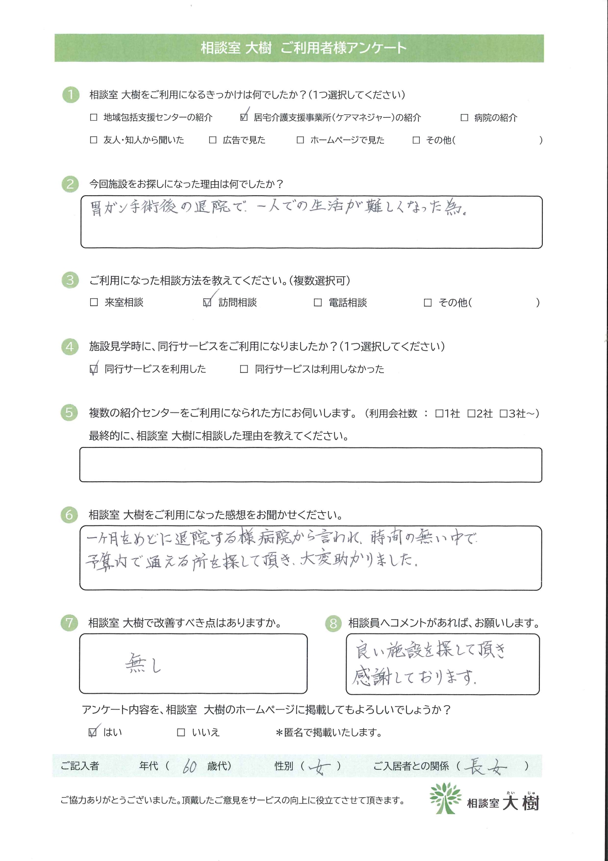 ご対象者様・ご家族様の今後のご健勝をお祈りいたしております。今回はアンケートにご協力頂き、ありがとうございました。